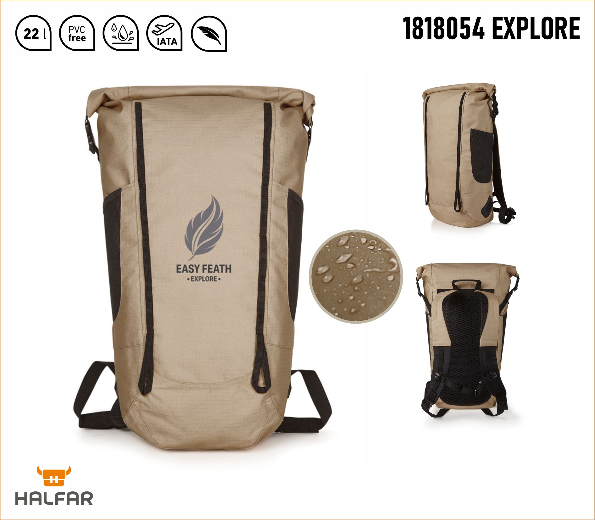 EXPLORE – wodoodporny plecak rolltop do podróży, na zewnątrz i codziennego użytkuPlecak EXPLORE łączy w sobie funkcjonalność, design i odporność na warunki atmosferyczne Rozmiar: 24x45x19 cm Pakowanie: 10 szt./karton Specyfikacja: wysoce funkcjonalny, wodoodporny plecak rekreacyjny; system zamykania z bocznymi klamrami; gumowa pętla na nadmiar materiału paska; uszczelnione szwy; elastyczne kieszenie boczne z siatki; pasek pętli z przodu; wiszący zamek błyskawiczny w środku; wyściełany system przenoszenia z indywidualnie regulowanym pasem piersiowym; uchwyt pojemność: 22l |
