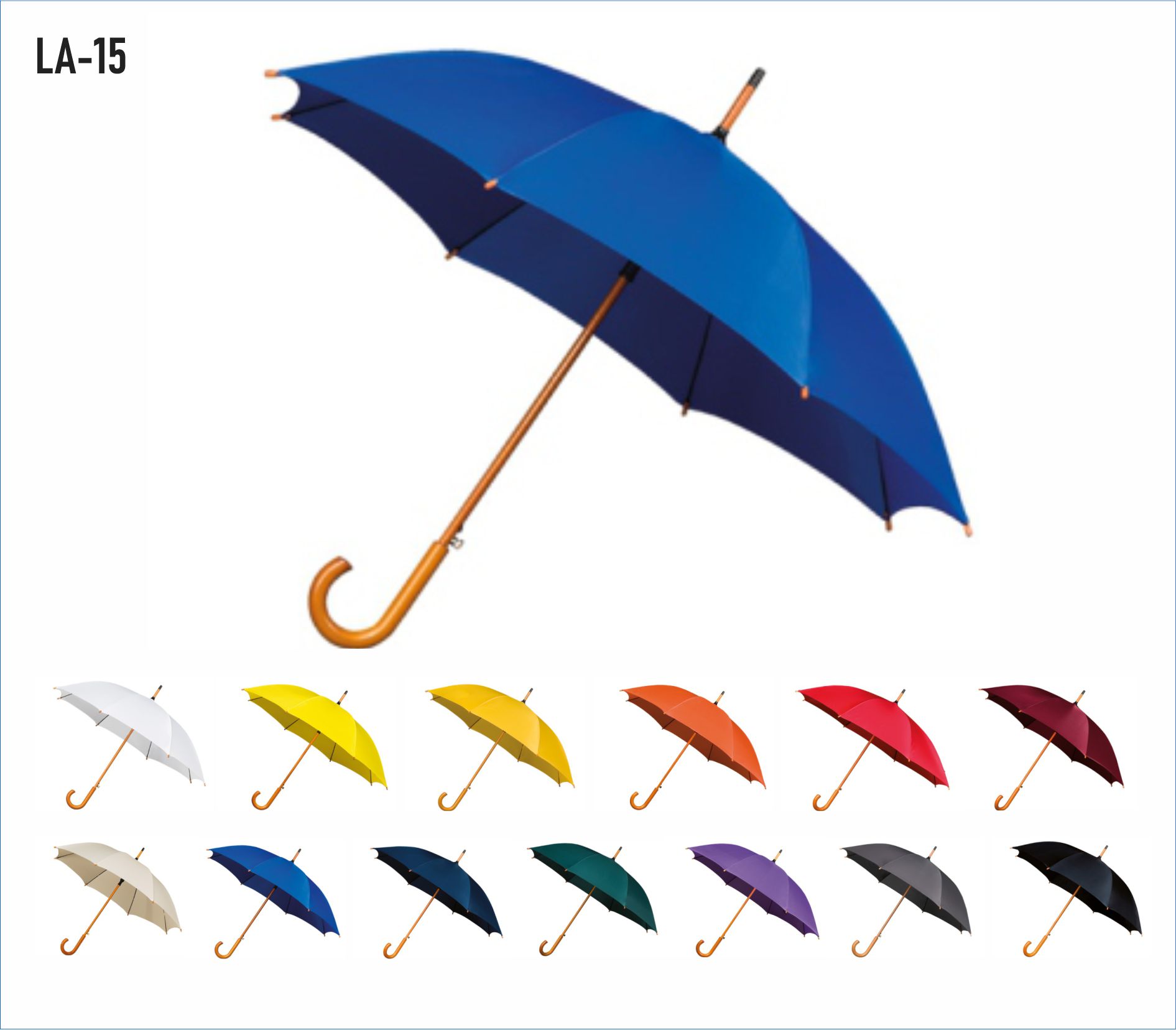 Długi parasol automatycznie otwierany. Drewniany kij. Drewniana zakrzywiona rączka. Drewniane kolce na zakończeniach brytów. Drewniane elementy mogą posiadać przebarwienia co wynika z jego naturalnych właściwości i nie stanowi podstawy do reklamacji. Metalowy stelaż. Średnica: 102 cm Długość: 89 cm Rączka: drewniana zagięta Brytów: 8