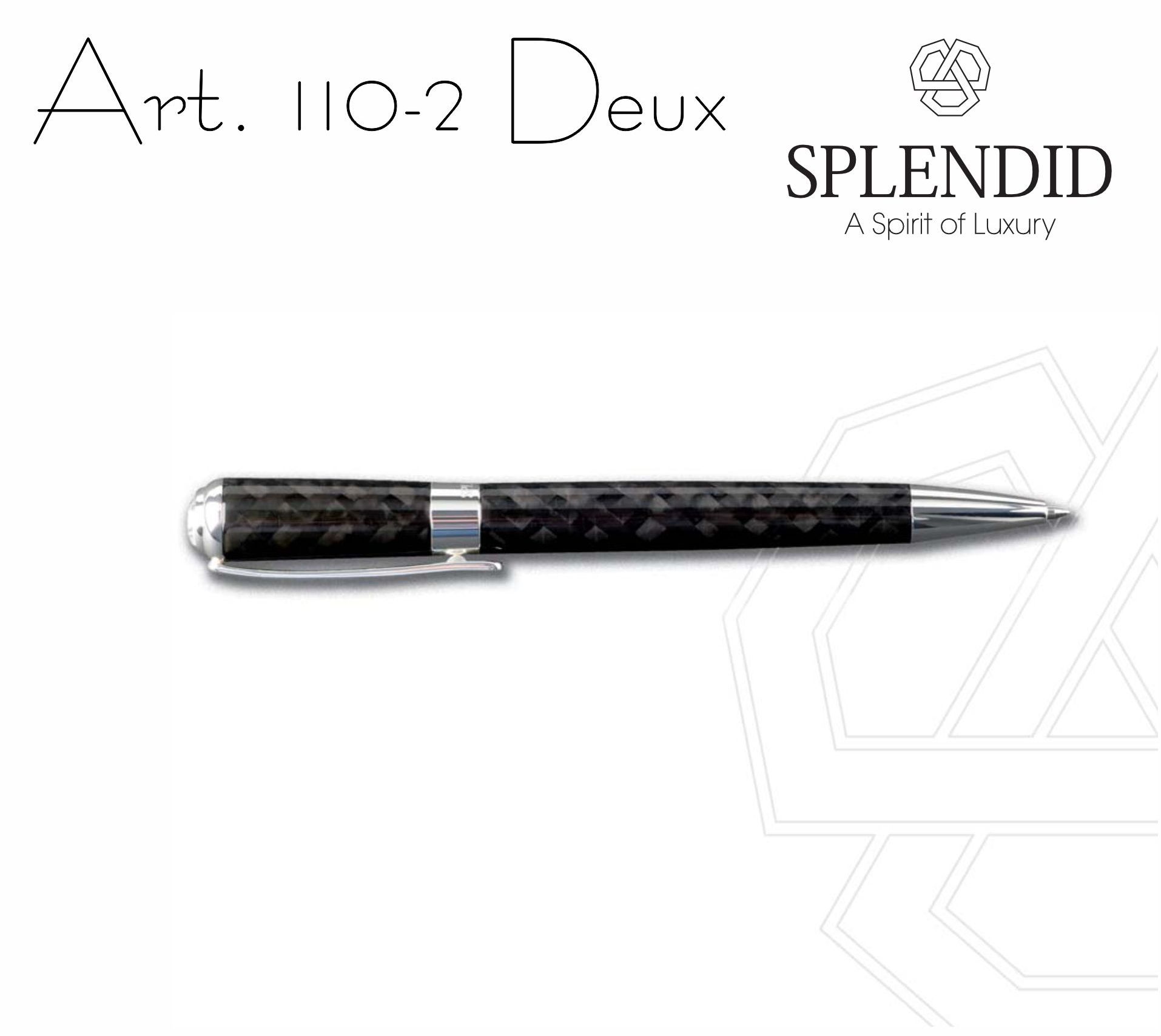Rotary ballpen, hand-finished brass housing encased in carbon and silver plated, Schmidt stainless-steel cartridge, one CRYSTALLIZED™ - Swarovski Elements. Every SPLENDID writing instrument is supplied in a high-quality gift box.