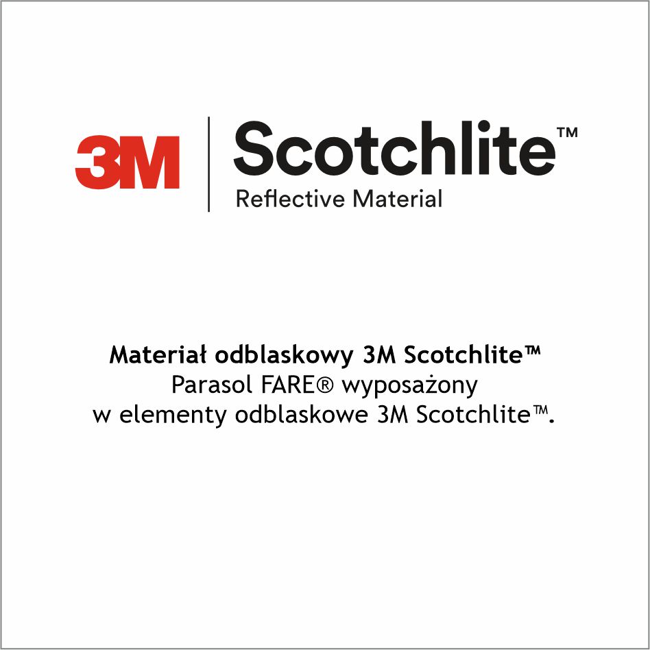 Czasza z odblaskowymi elementami 3M ™ Scotchlite ™ w narożnikach brytów i rączka z ruchomą latarką LED dla optymalnej widoczności w ruchu drogowym. Funkcja z ciągłym białym światłem i migającym czerwonym. Wygodna funkcja szybkiego automatycznego otwierania. Elastyczny stelaż z włókna szklanego. Większa elastyczność i stabilność w warunkach wietrznych dzięki wiatroodpornej funkcji. Przyjemna w dotyku, powlekana rączka z płaskim przyciskiem otwierania i możliwością personalizacji - możliwość wklejenia domingu. Podwyższona ochrona przed korozją dzięki galwanizowaniu kija parasola na kolor czarny. 14 mm stalowy kij. Kolorystyka: czerwony, granatowy, szary, czarny