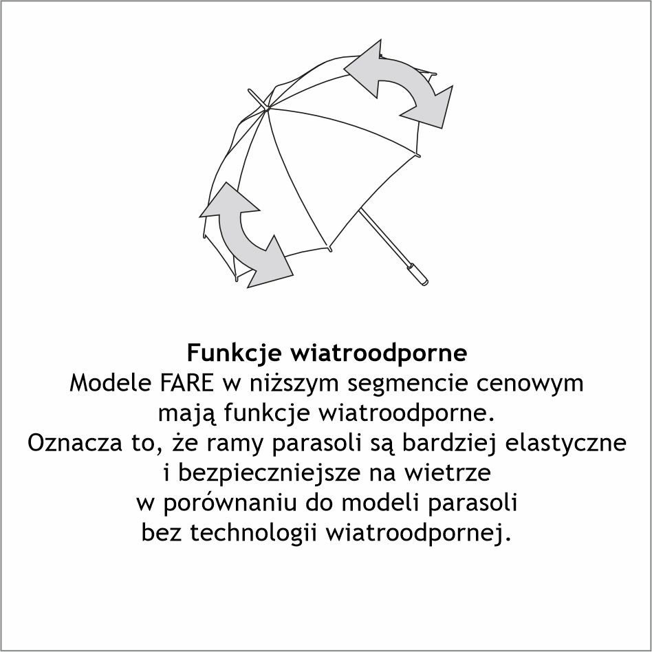 Stelaż o właściwościach wiatroodpornych wykonany z metalu i elementów z włókna szklanego. Wiatroodporne funkcje zapewniają większą elastyczność i stabilności w warunkach wietrznych. 10 mm stalowy kij. Podwyższona ochrona przed korozją dzięki galwanizowaniu kija parasola na kolor czarny. Prosta, matowa, czarna rączka z tworzywa sztucznego. Metalowy szpic. Szeroki paseczek do zapinania na rzep w kolorze czarnym. Możliwość wklejenia domingu o średnicy 20 mm. Nadruk Twojego motywu na całej powierzchni Zamówienie minimalne 100 sztuk Wydłużony termin realizacji.