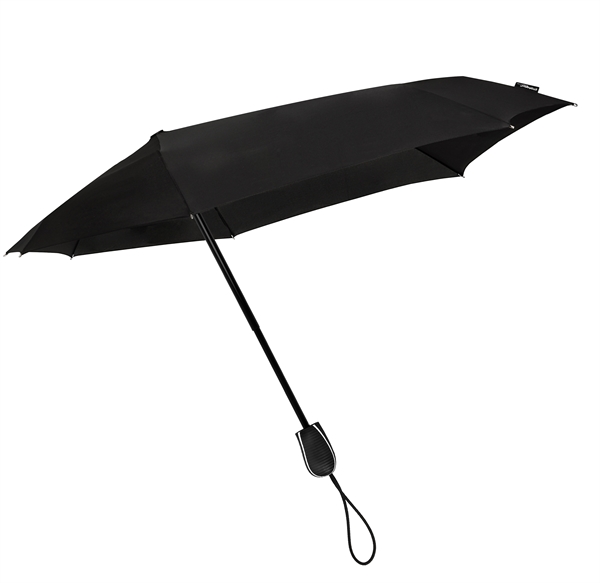 Krótki, manualny parasol sztormowy Aerodynamiczny składany parasol sztormowy STORMini® Ta ulepszona wersja naszego parasola sztormowego została przetestowana w tunelu aerodynamicznym i bez problemu wytrzymuje wiatr do 80 km/h. Ma wzmocniony, trzyczęściowy kij i wzmocniony, czarny stelaż z aluminium oraz włókna szklanego. Ma również bardzo wygodną, matową, czarną rączkę. Szeroki tył STORMini® zapewnia maksymalną ochronę przed deszczem! Pokrowiec w kolorze czaszy parasola. Długość: 29 cm Pokrycie: poliester pongee Rączka: plastikowa, gumowana Brytów: 8 Sztuk w kartonie: 50
