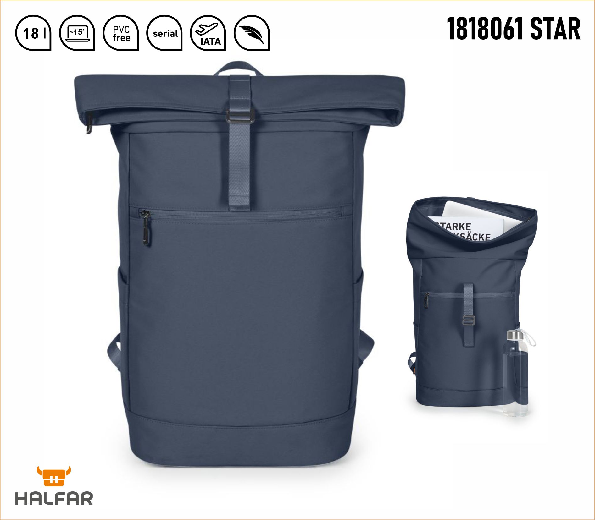 Materiał: poliester Rozmiar: 43*28*16 cm Pakowanie: 20 szt./karton Specyfikacja: modny plecak zwijany; komora główna zapinana na zamek błyskawiczny z regulowanym systemem zapinania; pasek pętelkowy na pokrywie; wysokiej jakości akcesoria metalowe; wyściełana komora na notebooka; przednia kieszeń zapinana na zamek; dwie kieszenie boczne; wyściełana podstawa; wyściełany system nośny; pętla mocująca z tyłu do uchwytu walizki; uchwyt; pojemność 18l